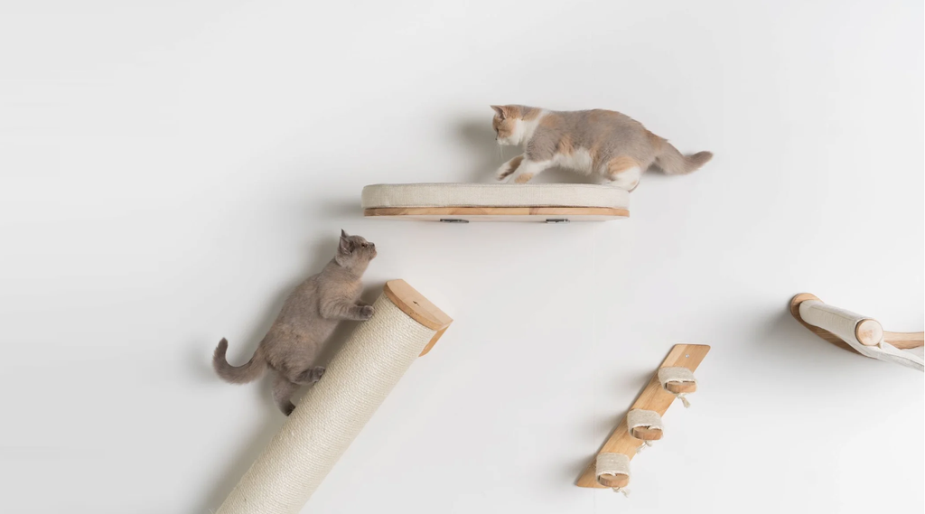 Kattenklimmeubels die aan de muur of aan het plafond worden bevestigd, worden steeds populairder omdat ze een complete klimervaring bieden zonder vloerruimte in te nemen. Deze systemen bieden je kat de mogelijkheid om op hoogte te klimmen en te spelen, wat hun natuurlijke instincten bevredigt en hen de kans geeft om hun territorium vanuit verschillende perspectieven te verkennen. Wandplanken, bruggen en hangmatten kunnen worden gecombineerd tot een waar avonturenparcours voor je kat, wat zorgt voor urenlang entertainment.
